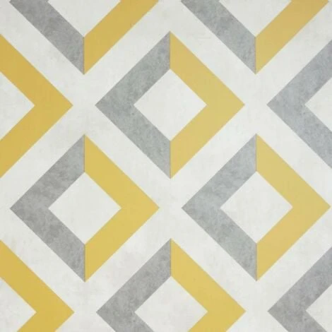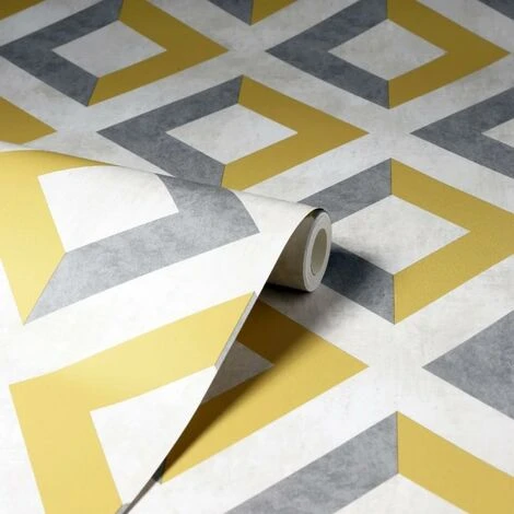 A striking geometric wallpaper design that comes in a contemporary colour palette of ochre yellow, grey and neutral. A large scale diamond pattern that will make an impact wherever is hung. Whether you hang it in a kitchen, hallway, study or conservatory it will give your room a great strong up to date look.