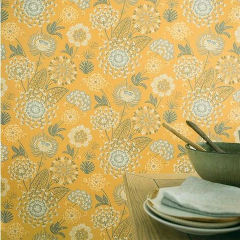 Arthouse Vintage Bloom Mustard Yellow Wallpaper 676206Quality vinyl wallcoveringFeatures grey, white, yellow vintage floral patterns on a mustard yellow backgroundPaste the paper – full hanging instructions on the back of each wallpaper labelOffset matchPattern repeat: 32cmSpongeableWet removableSatisfactory lighfastnessRoll size: 10m x 0.53mCoverage per roll: 5.32sqm approxAll rolls ordered together will be the same batch number