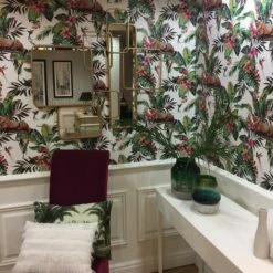 Animal Jungle White Wallpaper Arthouse Green Tropical Floral Leopards Birds