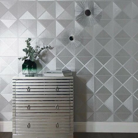 The Arthouse Diamond Geo Silver Foil Metallic Wallpaper is an easy way to add a dash of colour to your walls. This striking wallpaper is sure to make a welcome addition to your home. Features a silver metallic foil diamond geometric design which looks stunning as it shimmers in the light on a textured Vinyl background for a truly mesmerising wallpaper.